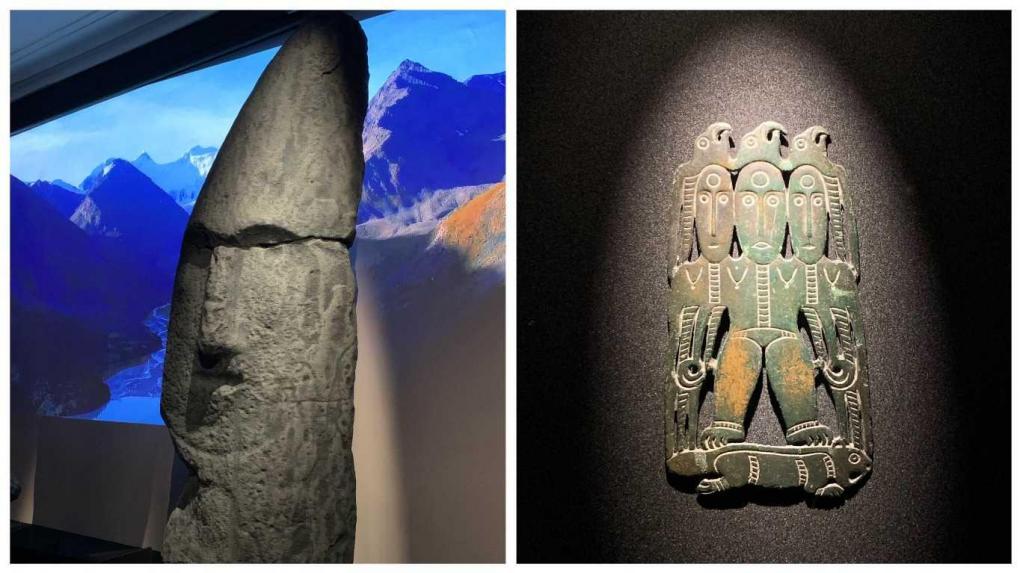 Экспонат слева — Стела с реки Бюрь (конец III — начало II тыс. до н.э.), справа — пластина с изображением животных и орнито-антропоморфных персонажей (VIII — IX вв. н.э.).