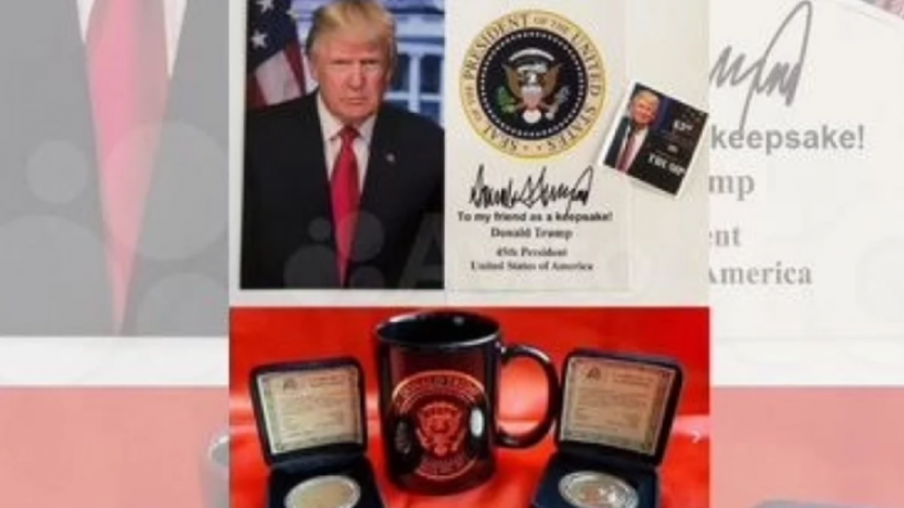 В Новосибирске на онлайн-платформе объявлений появилась в продаже коллекция памятных предметов с изображением Дональда Трампа, включающая золотосодержащие монеты и фарфоровую кружку, которая, по утверждению продавца, была доставлена в Россию по дипломатическим каналам в 2017 году.